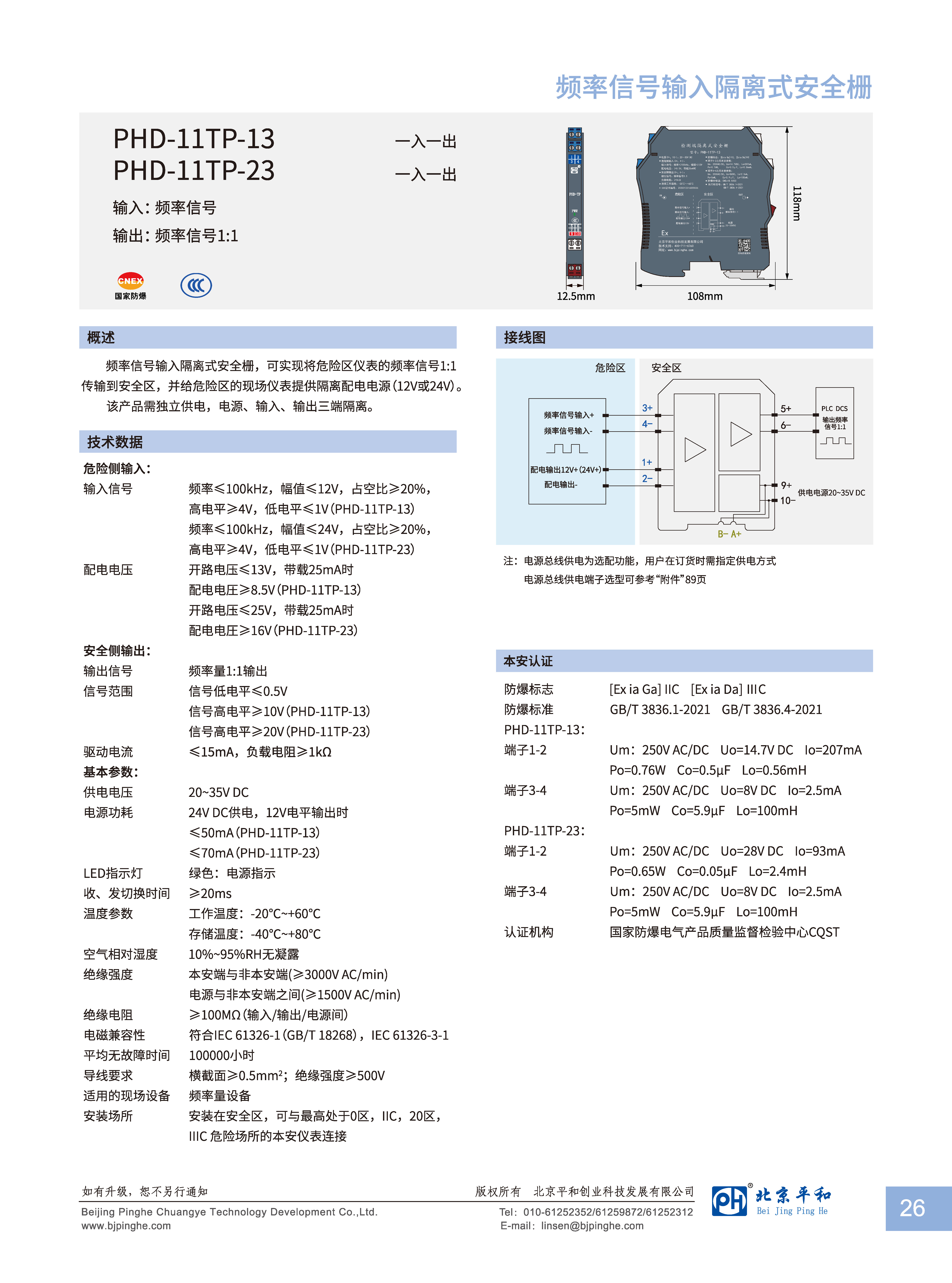 频率信号输入隔离式安全栅,可实现将危险区仪表的频率信号1:1传输到安全区,并给危险区的现场仪表提供隔离配电电源(12V或24V)。