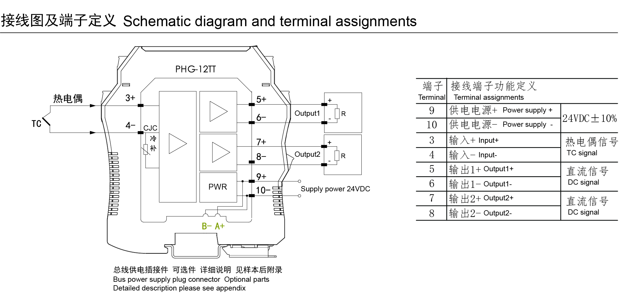 热电偶输入温度变送器,可将热电偶(TC)发出的直流信号隔离转换为直流信号,此产品内置冷端补偿功能,可智能组态,热电偶的实际量程范围可通过计算机软件进行设定。具有断线报警功能和超出量程范围报警功能。该产品需独立供电,电源、输入、输出三端隔离。