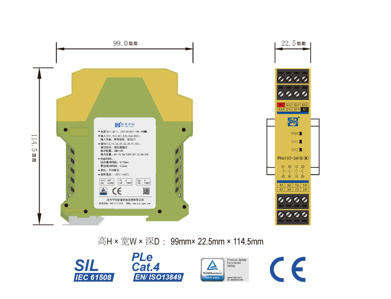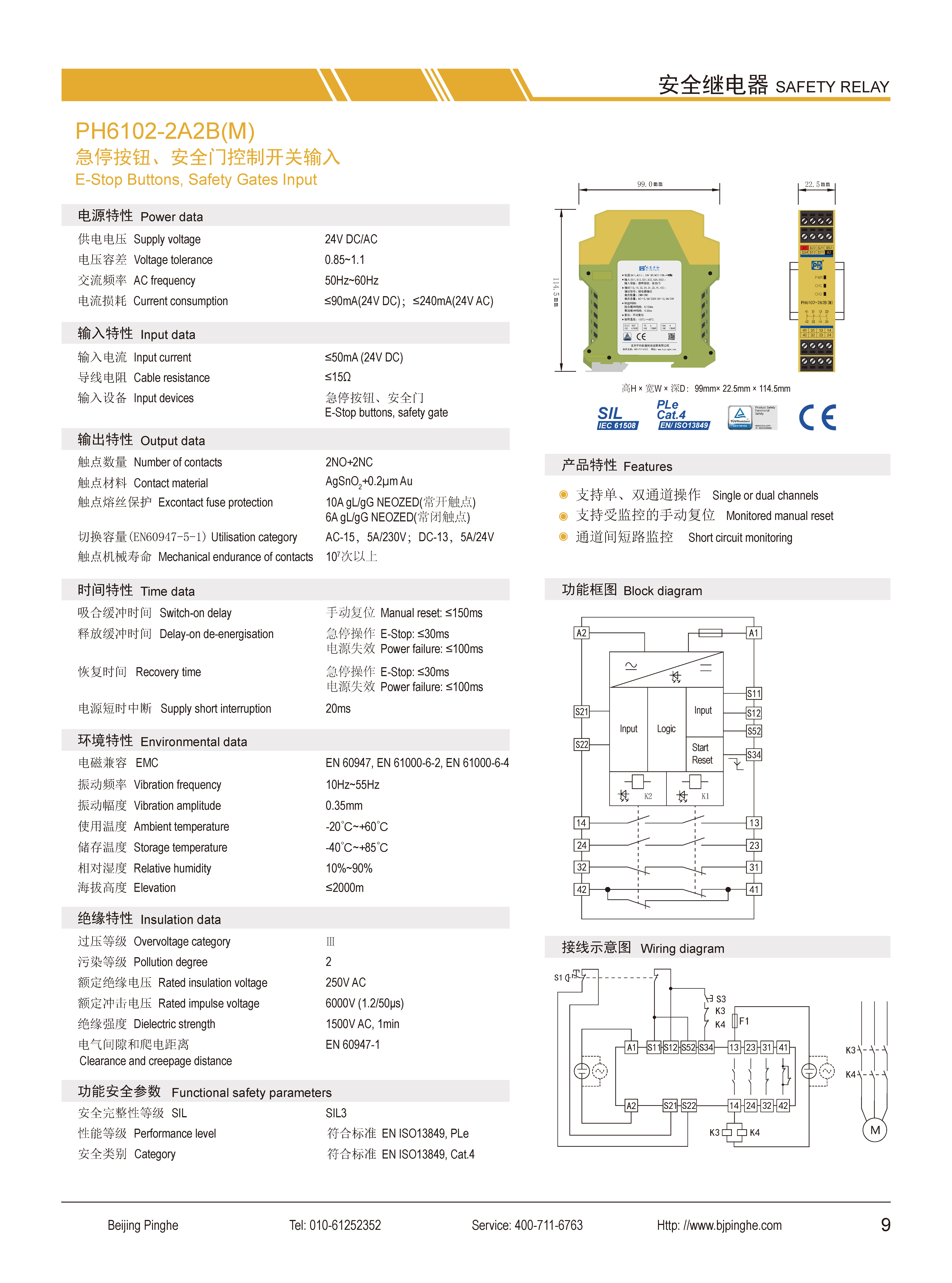 PH6102-3A1B(M)是一款安全继电器控制模块,适用于急停按钮、安全门控制开关输入,具有3路常开(NO)安全输出触点和1路常闭(NC)辅助输出触点的安全继电器。它支持单、双通道操作,手动复位,并具有通道间短路监控功能。