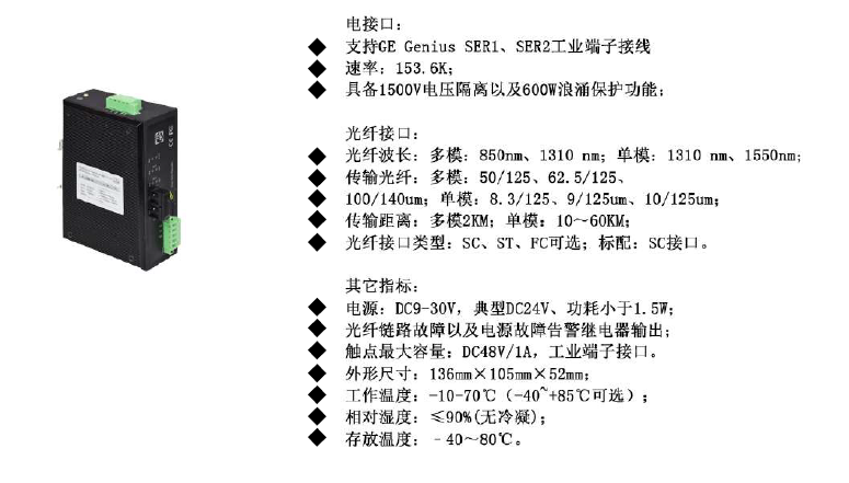 支持GE Genius SER1、SER2工业端子接线 速率:153.6K; 具备1500V电压隔离以及600W浪涌保护功能: