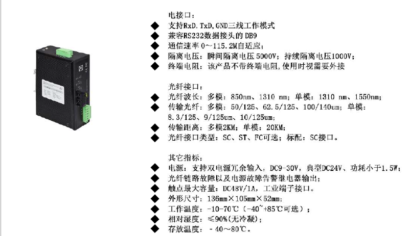 *支持RS-232工业控制现场总线协议。通信速率0~115.2M自适应。*光纤最远通信距离可达6OKM。