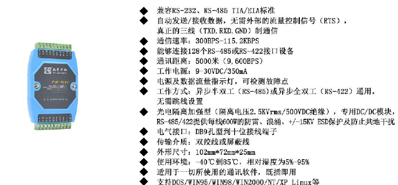 工作方式 | 异步半双工(RS-485)或异步全双工(RS-422)通用,无需跳线设置 |