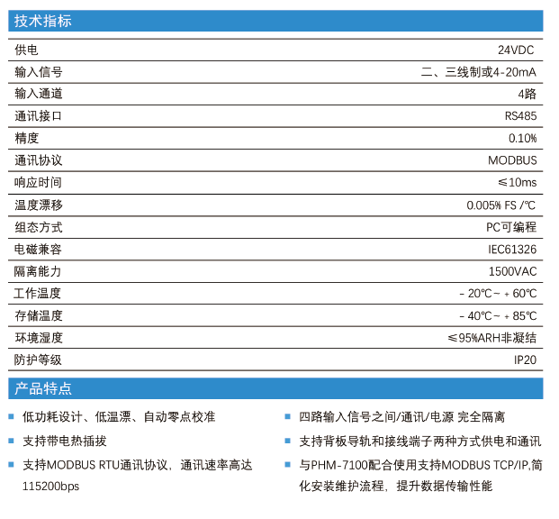 将工业现场的四路电流信号转换为数字信号,按照MODBUS规约,通过RS485通讯方式,将数字信号提供给PHM-7100、PLC或上位机系统。