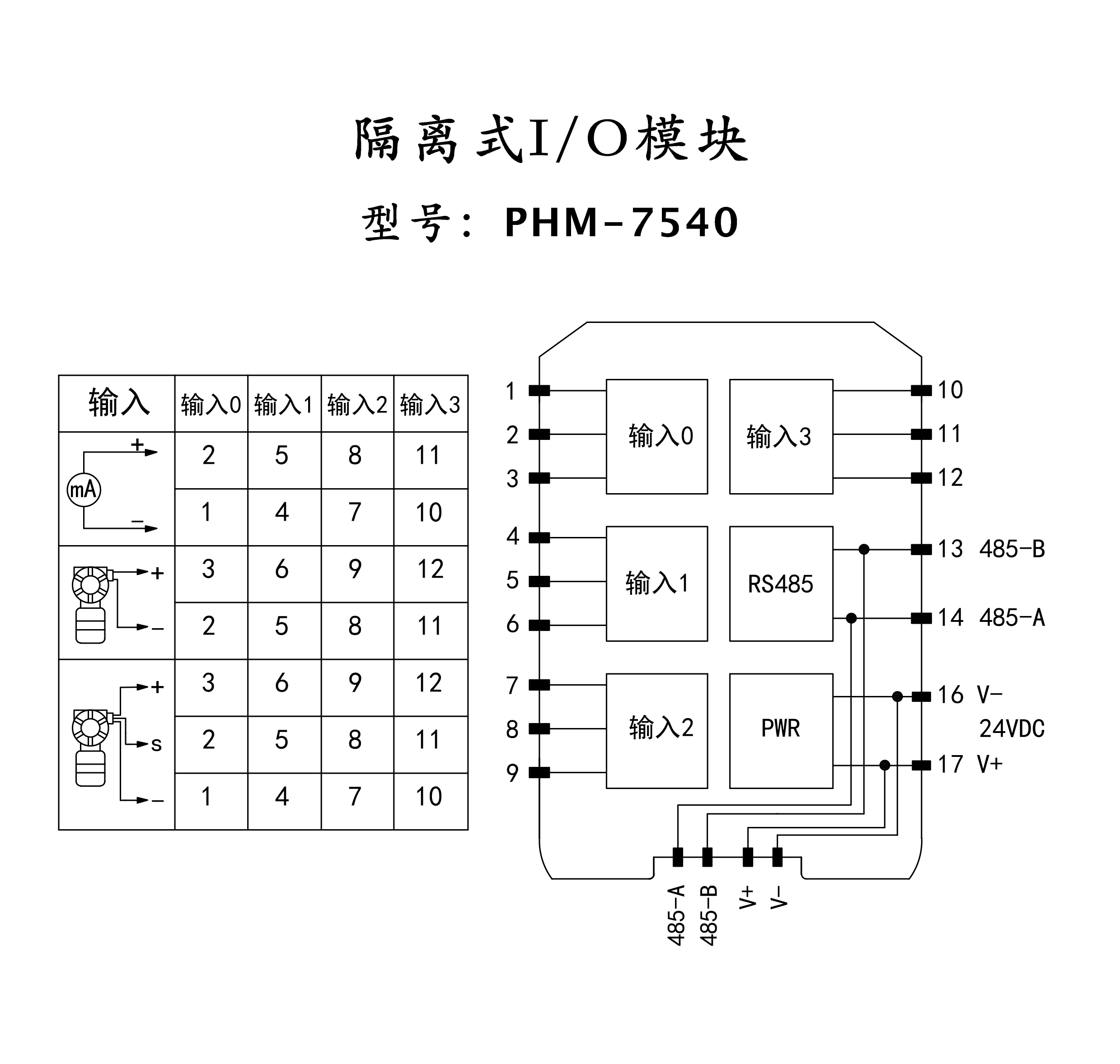 将工业现场的四路电流信号转换为数字信号,按照MODBUS规约,通过RS485通讯方式.将数字信号提供给PHM-7100、PLC或上位机系统。
