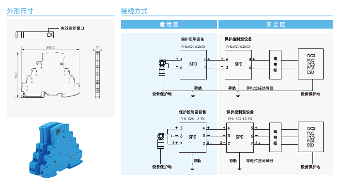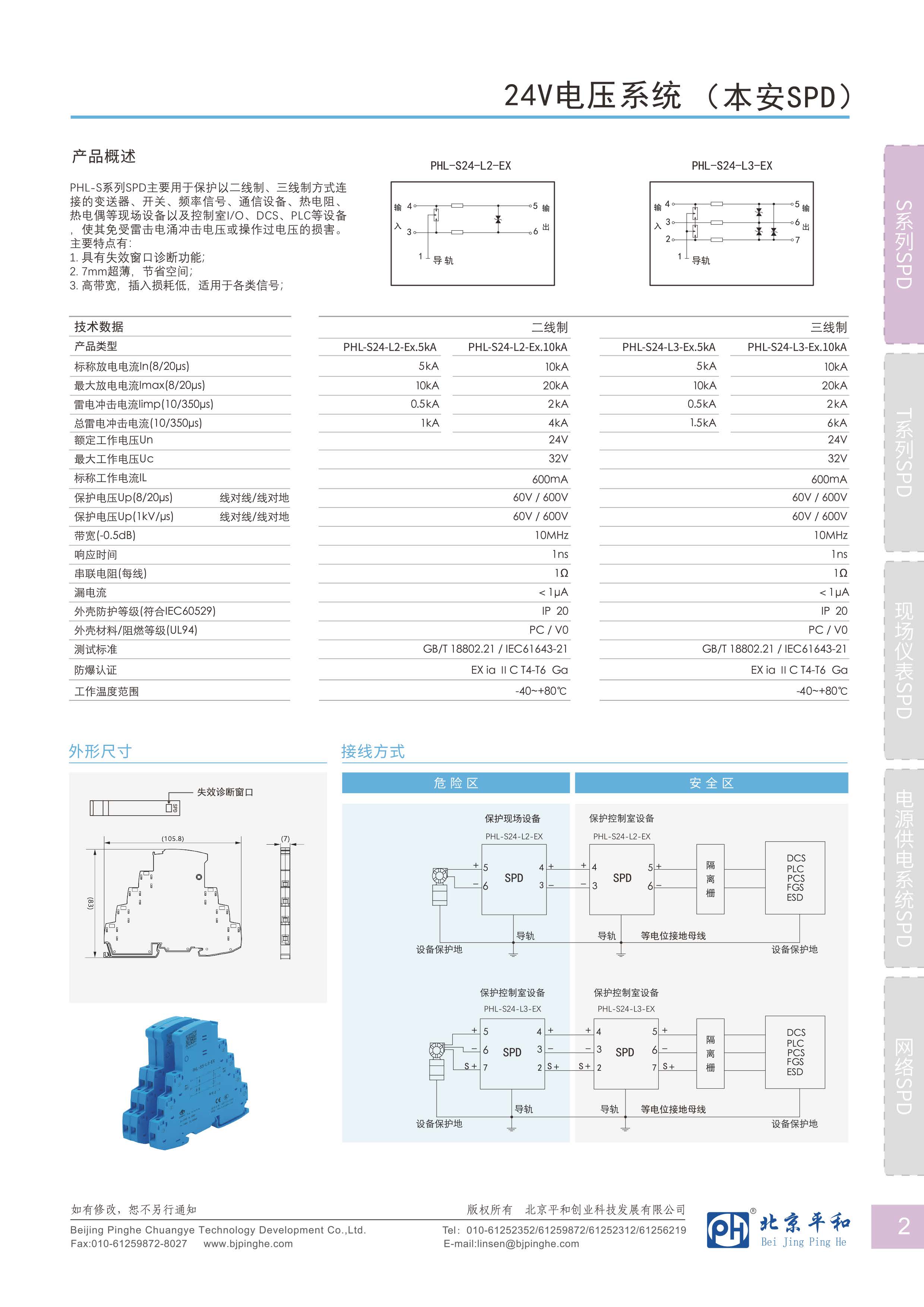PHL-S系列SPD主要用于保护以二线制、三线制方式连接的变送器、开关、频率信号、通信设备、热电阻、热电偶等现场设备以及控制室I/O、DCS、PLC等设备,使其免受雷击电涌冲击电压或操作过电压的损害。主要特点有:
