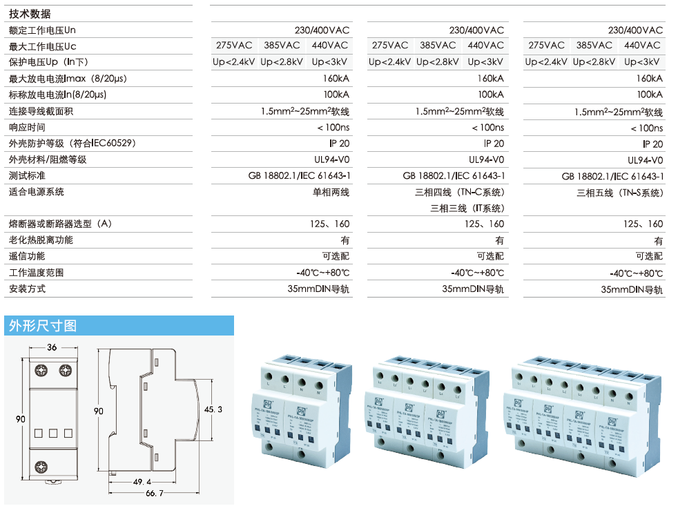 用于雷电防护等级为A级及以下的第一级电源浪涌?;て?,适合安装在雷击高发区,架空线直接入户的场合,以及其它LPZ0A与LPZ1区的交界处。