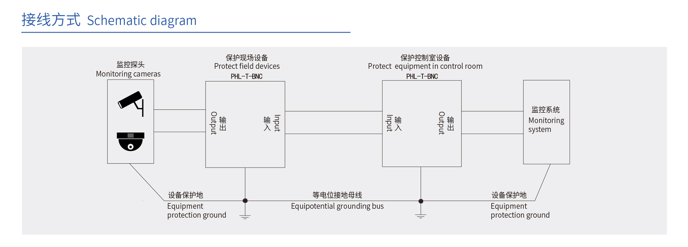 标准BNC同轴接口,用于标清同轴视频监控系统的防雷保护。