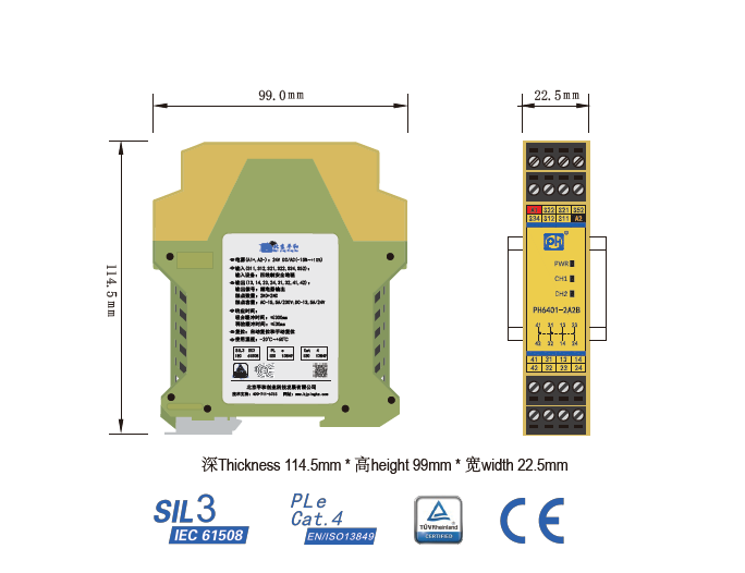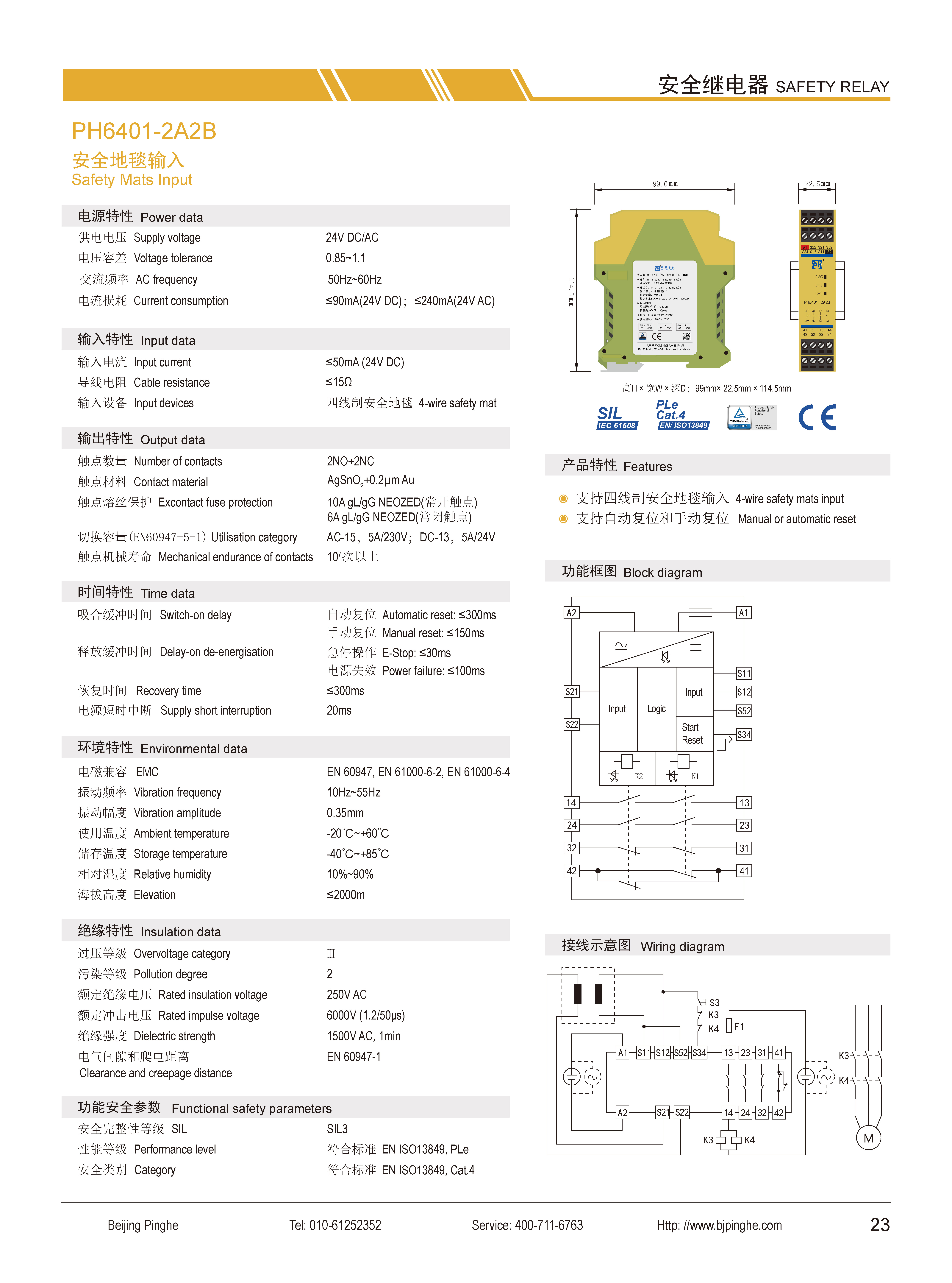 PH6401-2A2B是一款安全继电器控制模块,适用于安全地毯输入,具有2路常开(NO)安全输出触点和2路常闭(NC)辅助输出触点的安全继电器。它支持双通道操作,手动或自动复位功能。