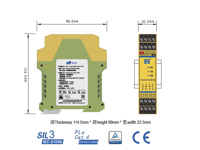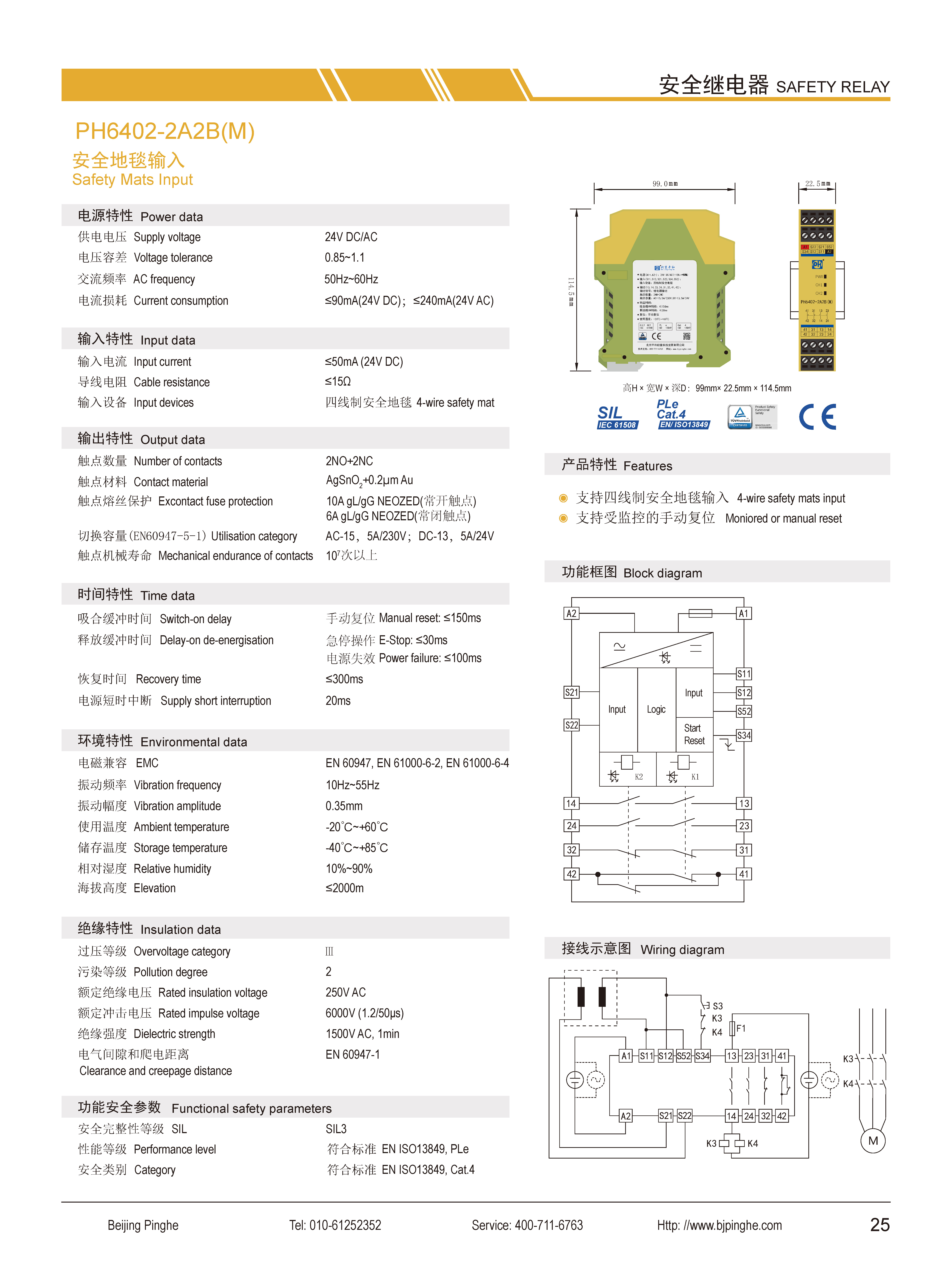 PH6402-2A2B(M)是一款安全继电器控制模块,适用于安全地毯输入,具有2路常开(NO)安全输出触点和2路常闭(NC)辅助输出触点的安全继电器。它支持双通道操作,手动复位,并具有复位按钮监控功能。