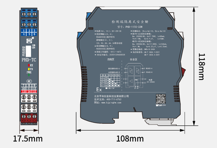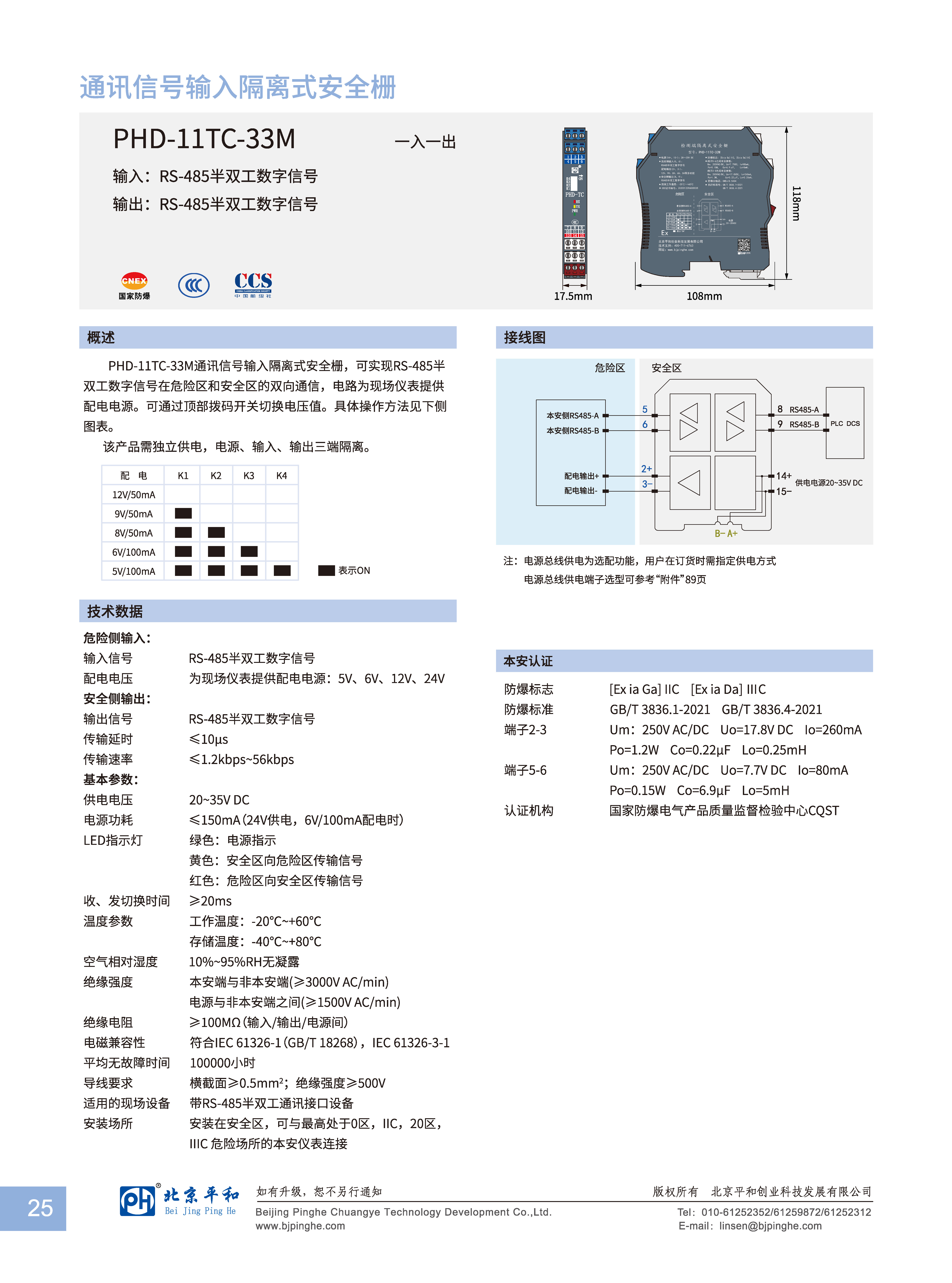 PHD-11TC-11通讯信号输入隔离式安全栅,可实现RS-485半双工数字信号在危险区和安全区的双向通信。电路为现场仪表提供配电电源。可通过顶部拨码开关切换电压值。具体操作方法见下侧图表。
