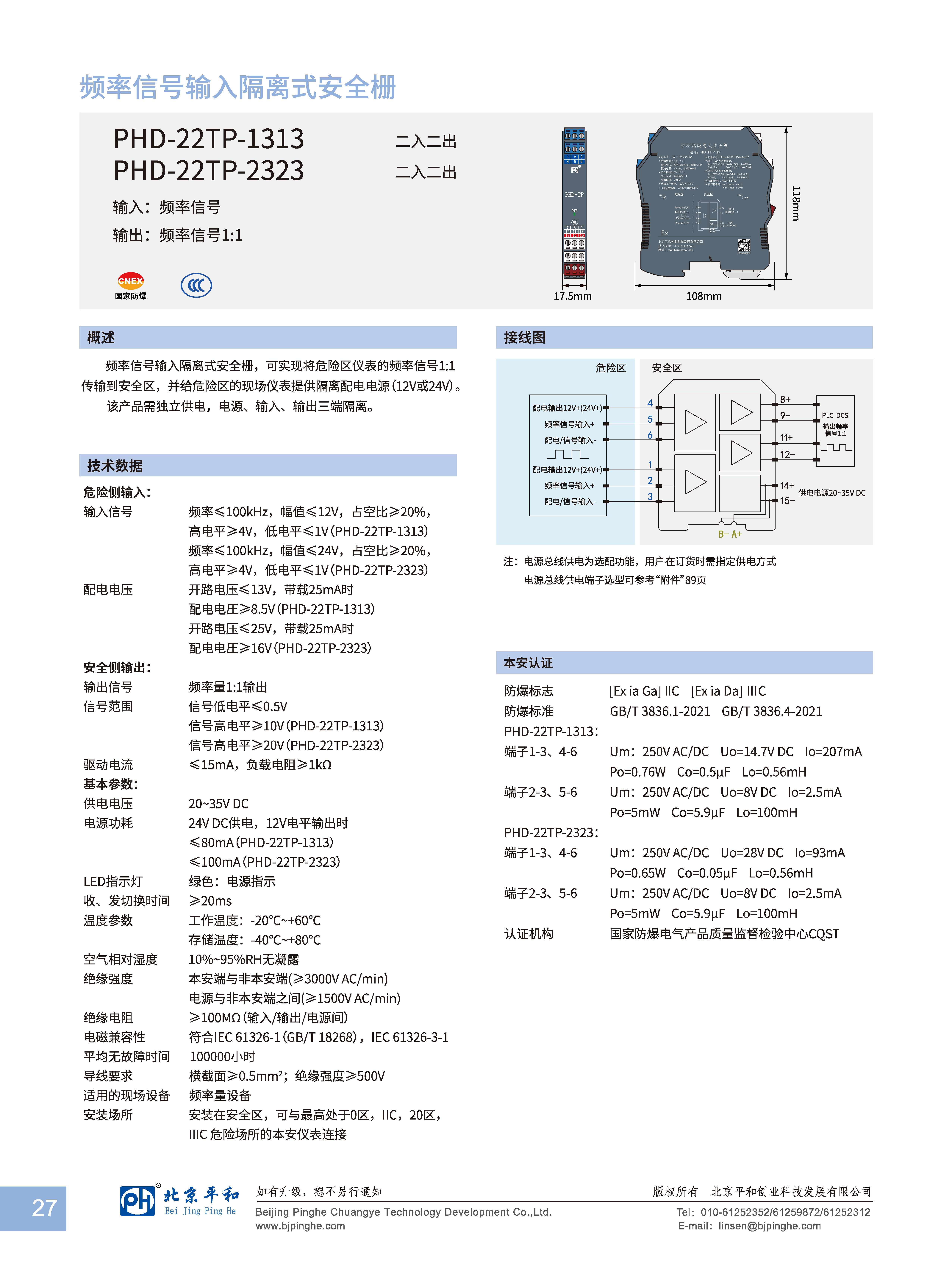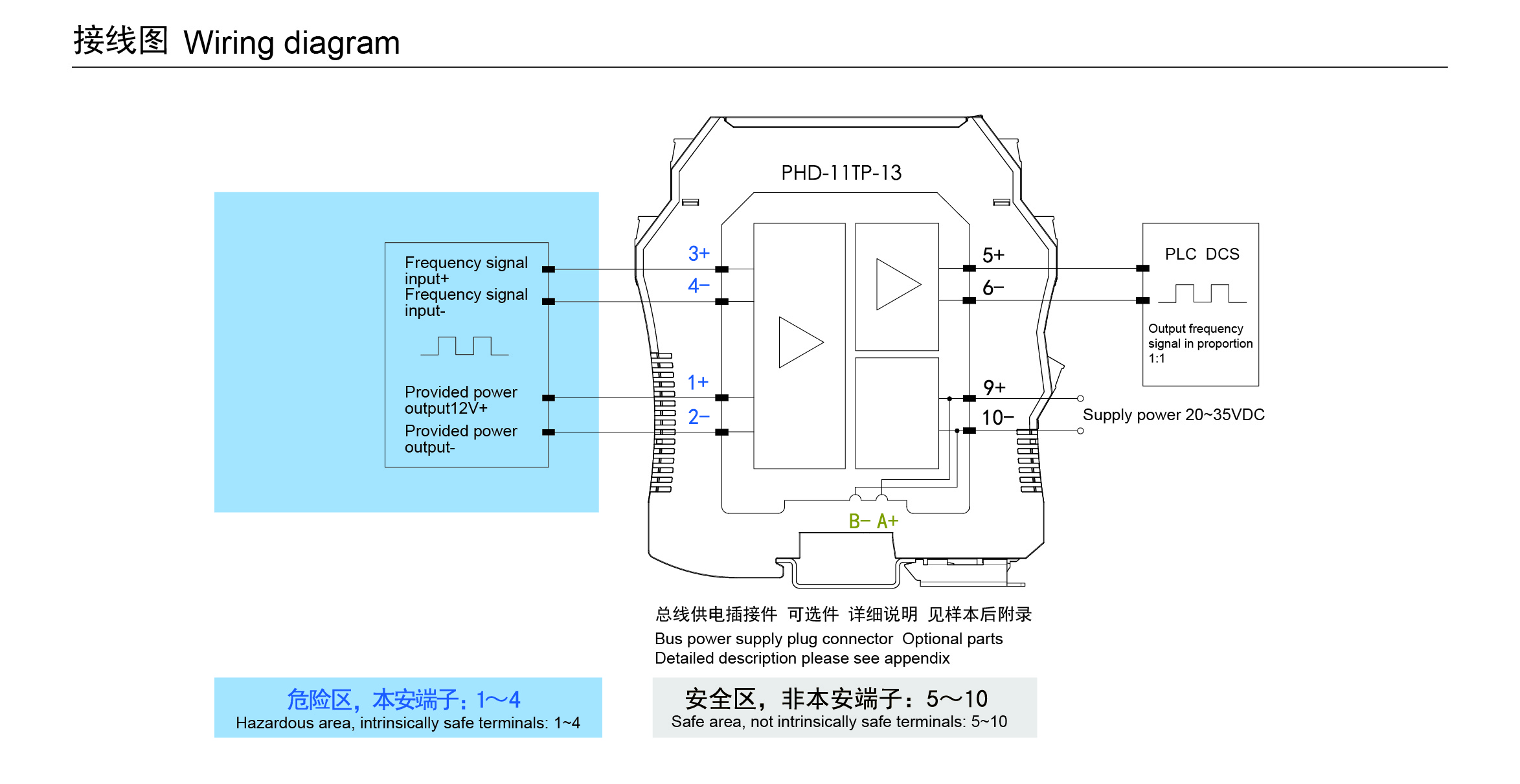 频率信号输入隔离式安全栅,可实现将危险区仪表的频率信号1:1传输到安全区,并给危险区的现场仪表提供隔离配电电源(12V或24V)。