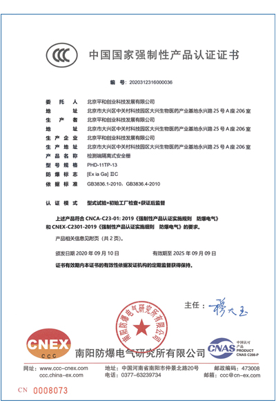 认证机构 | 国家防爆电气产品质量监督检验中心CQST认证 |