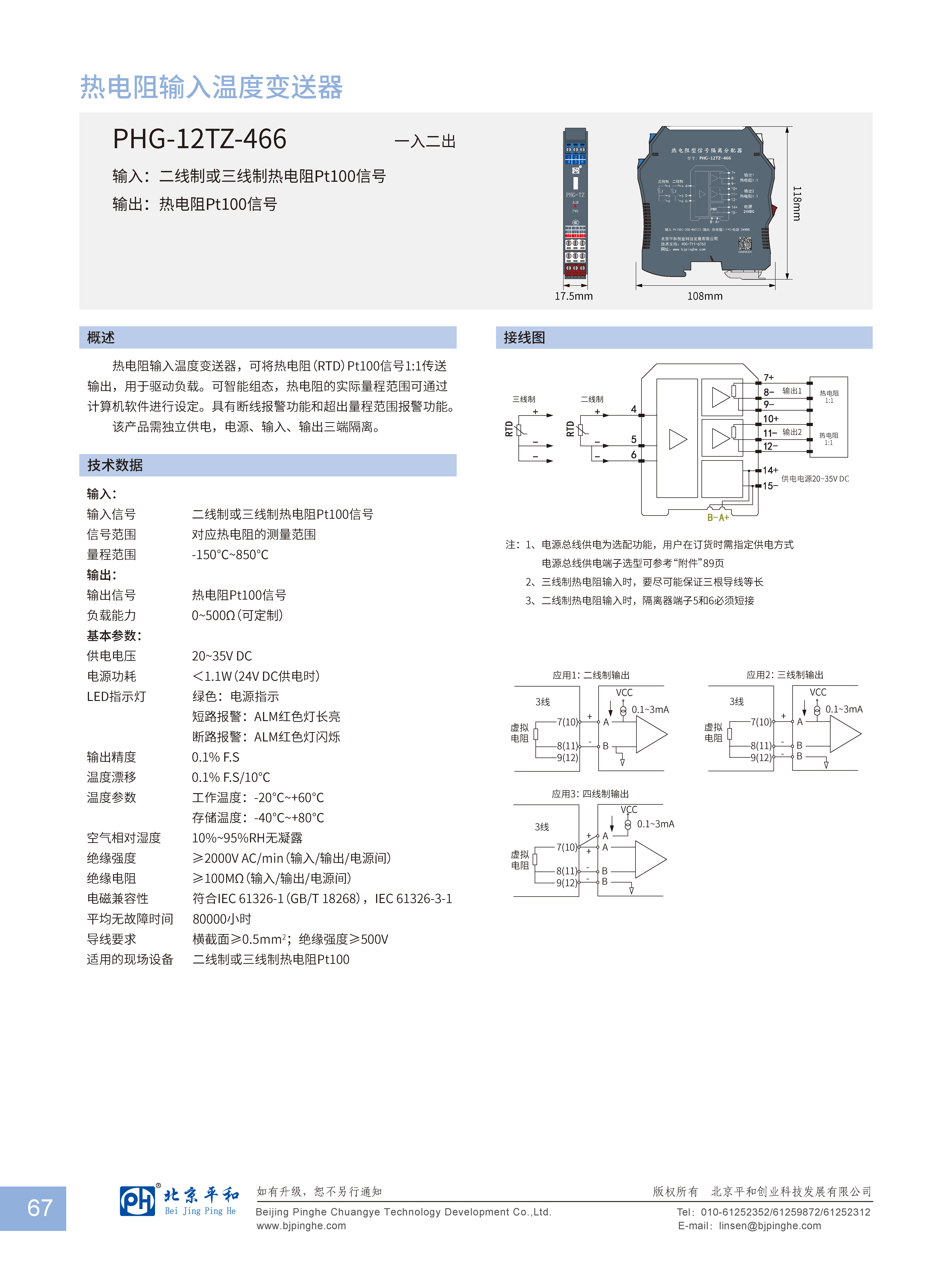 热电阻输入温度变送器,可将热电阻(RTD) Pt100信号1:1传送输出,用于驱动负载。可智能组态,热电阻的实际量程范围可通过计算机软件进行设定。具有断线报警功能和超出量程范围报警功能。