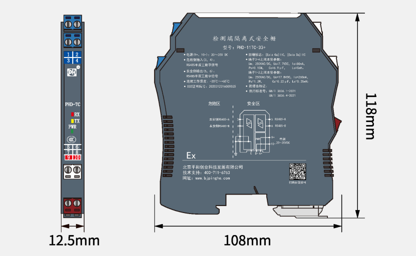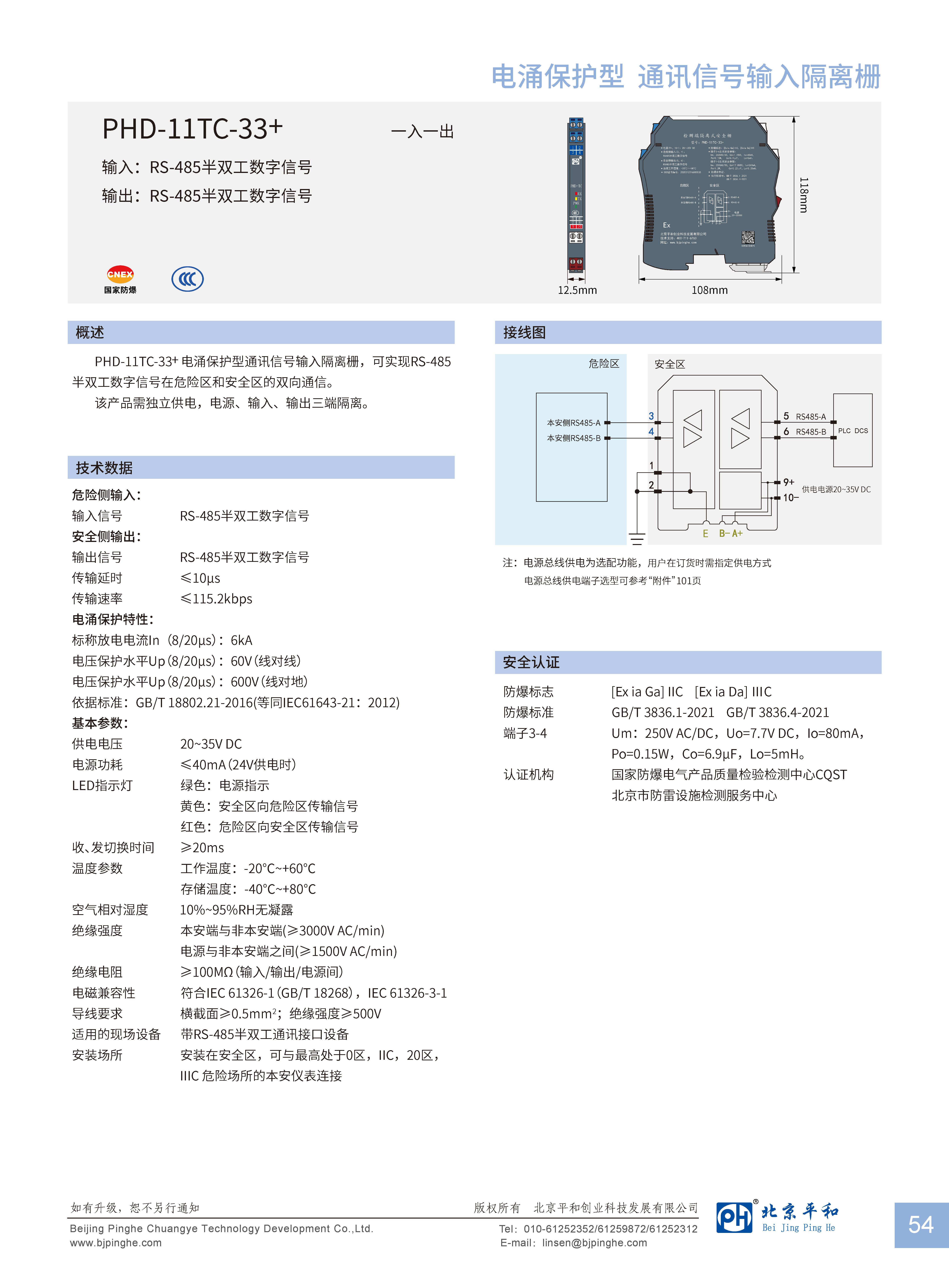 PHD-11TC-33+电涌保护型通讯信号输入隔离栅,可实现RS-485半双工数字信号在危险区和安全区的双向通信。