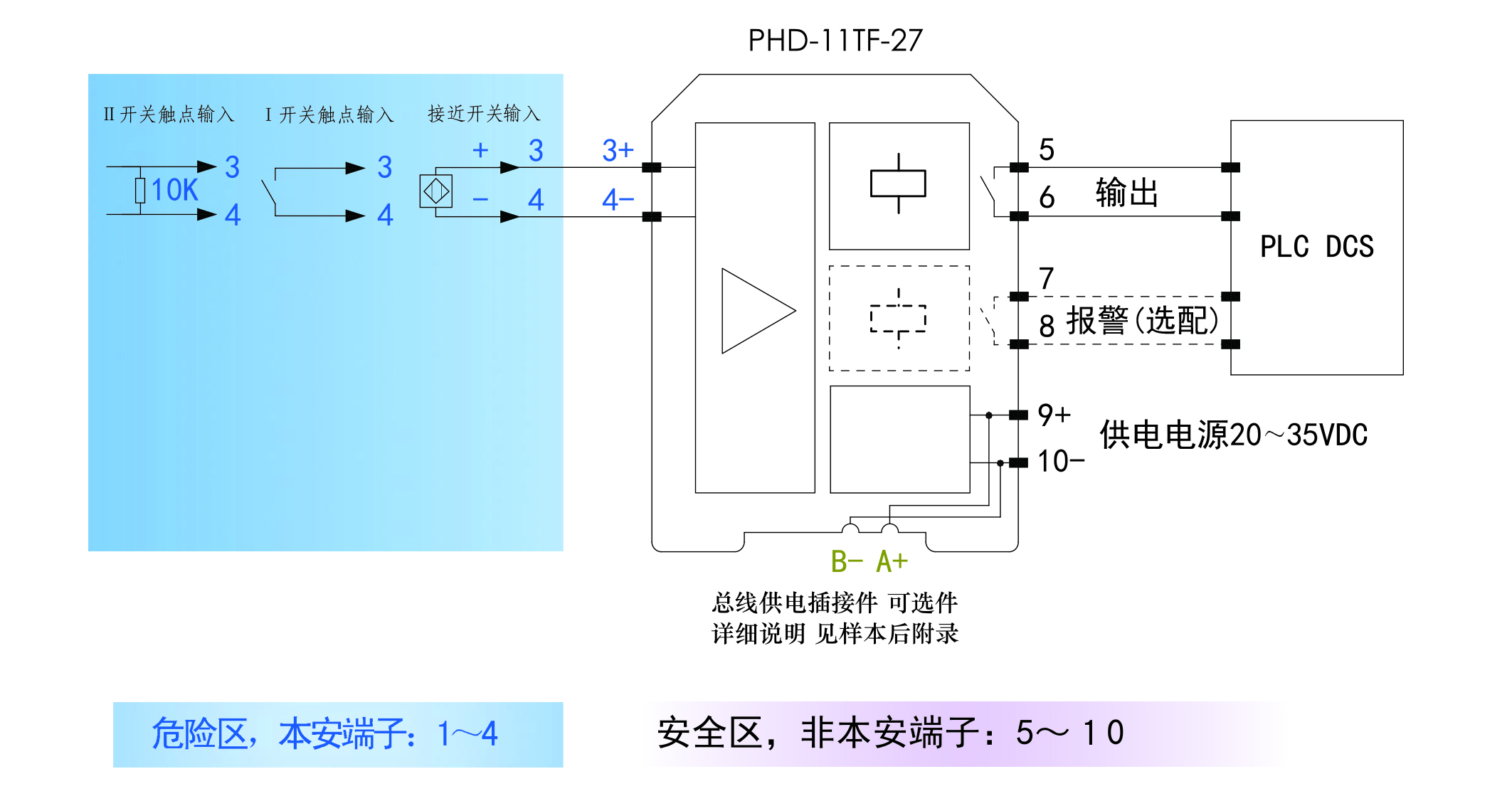指示灯报警功能 | 拨码开关K2置“ON”侧,电路选用指示灯红灯报警功能现场输入电流>7mA,短路报警(SC),现场输入电流<0.1mA,开路报警(LB)指示灯报警功能开关触点输入,需断线检测功能时,须在开关两端并联10KΩ电阻(如下图接线图中开关触点Ⅱ) |