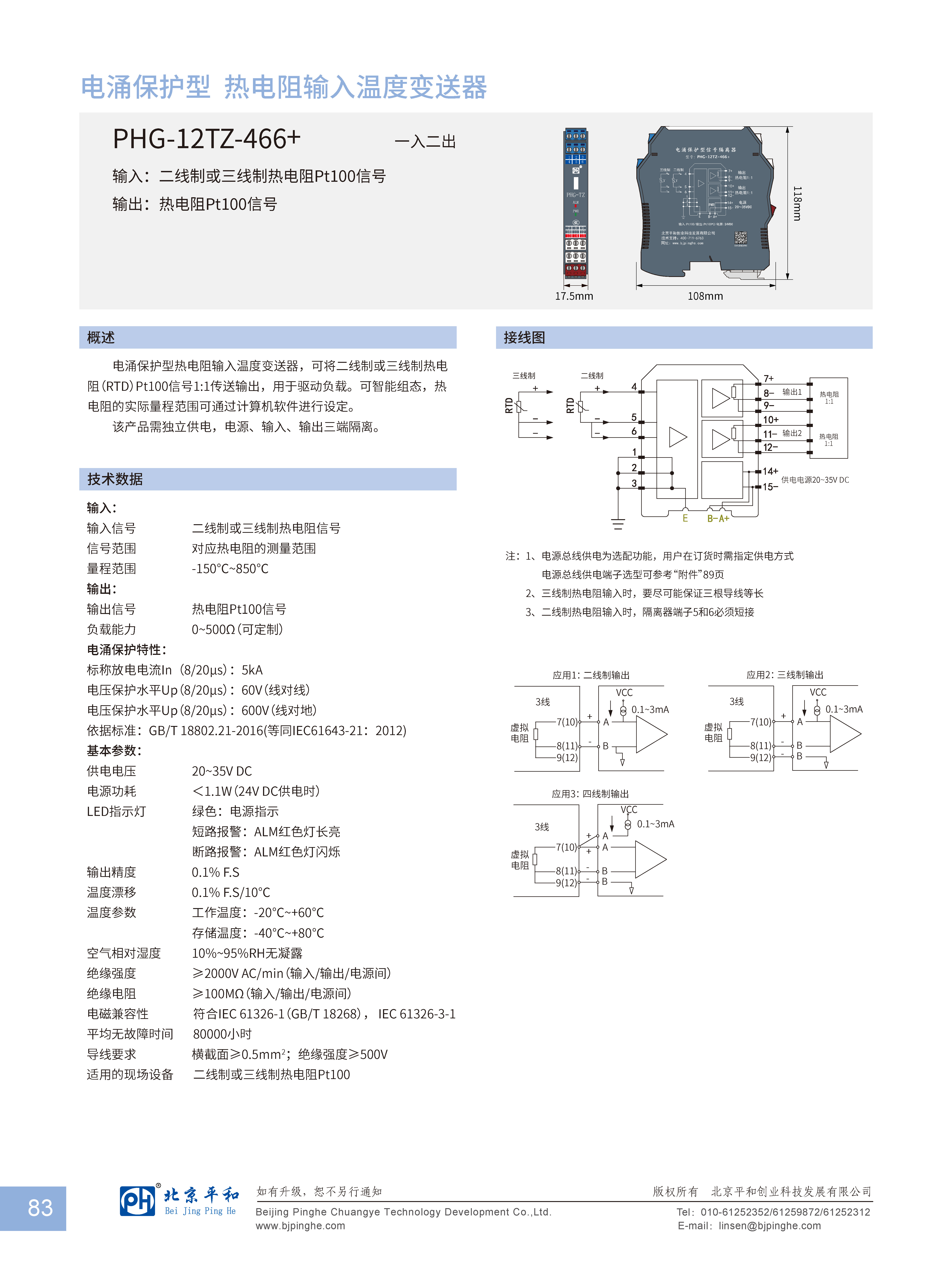 输入: 二线制或三线制热电阻Pt100信号