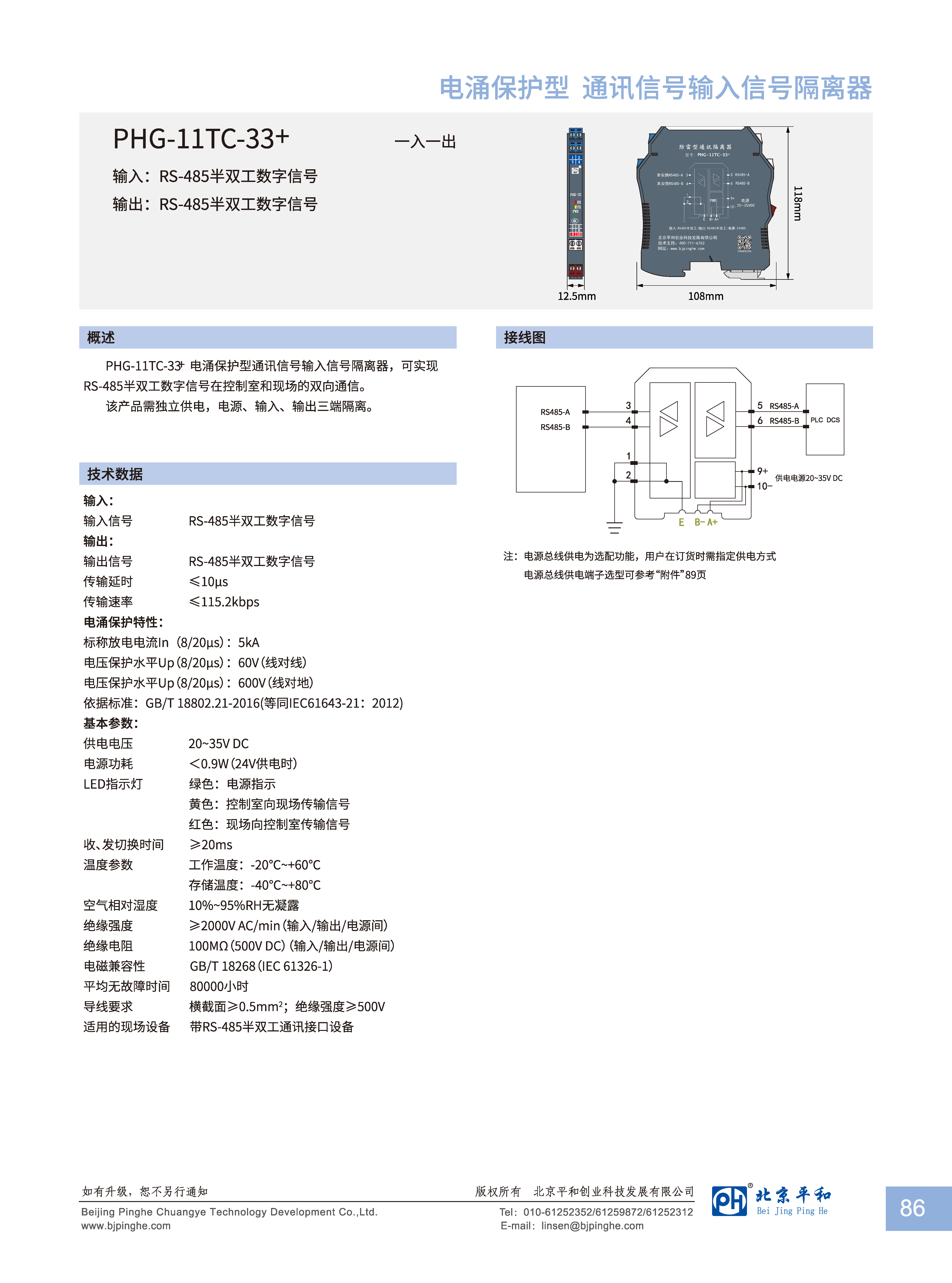 PHG-11TC-33+电涌保护型通讯信号输入信号隔离器,可实现RS-485半双工数字信号在控制室和现场的双向通信。