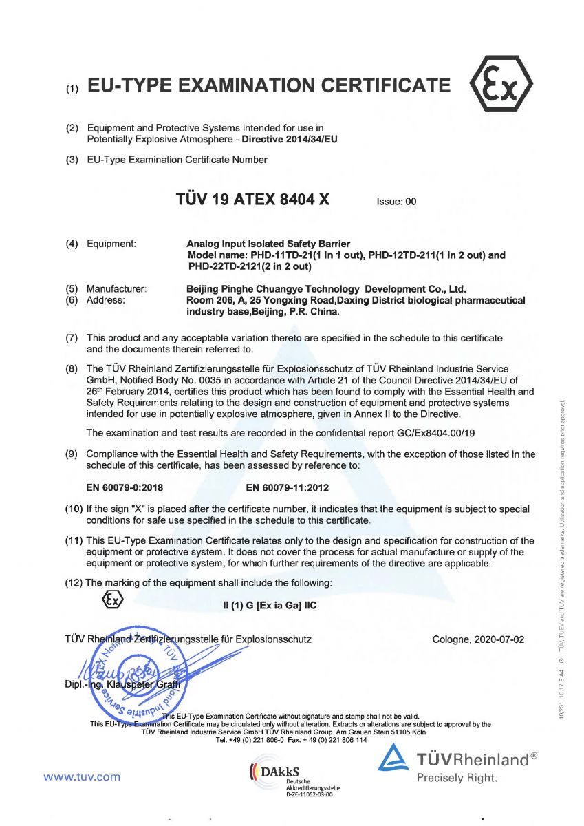 T系列隔离栅本质安全通过ATEX产品认证证书,表明平和产品在严苛工况下的卓越品质和可靠性能,在技术、管理等方面已达到国际一流水准。