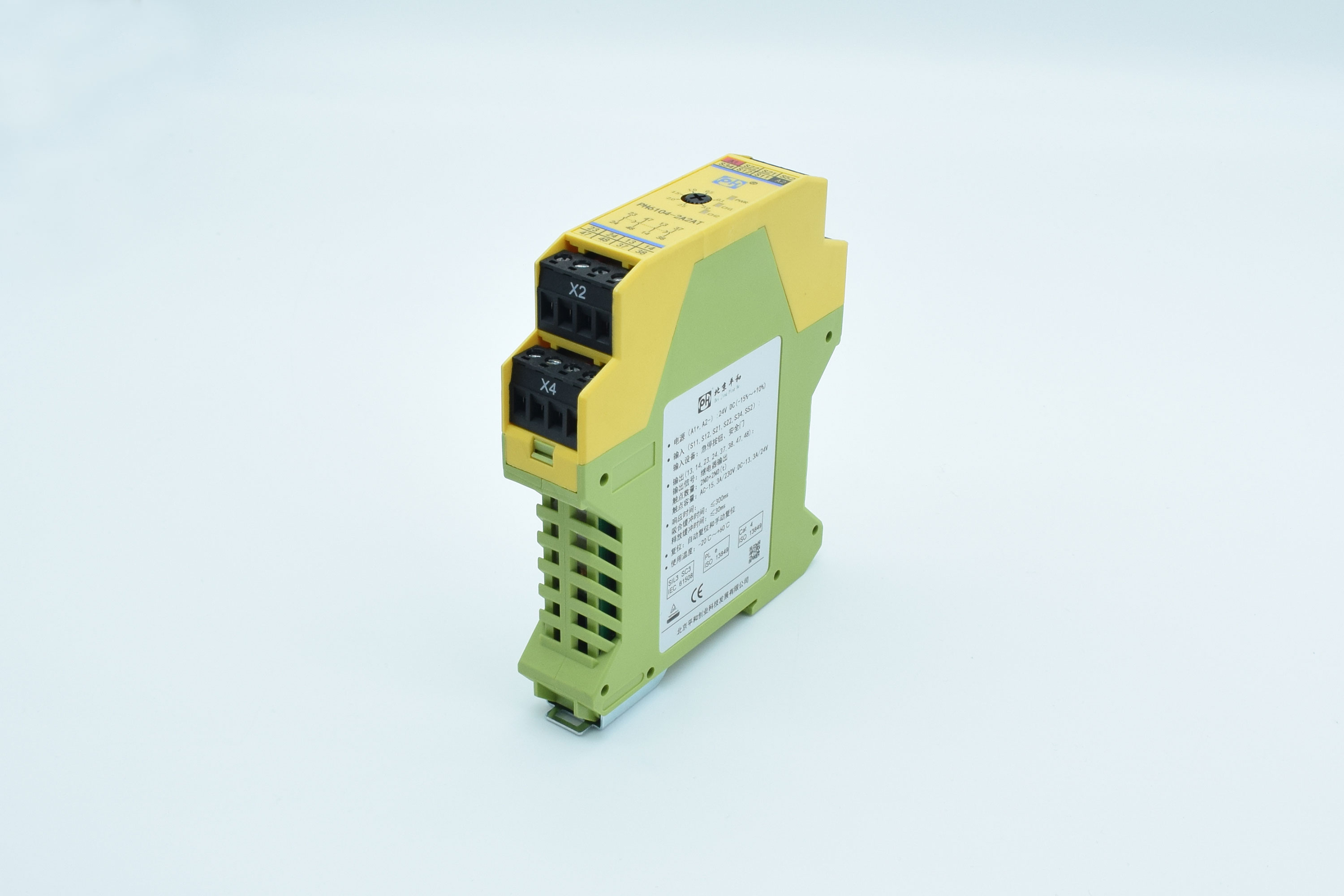 PH6104-2A2AT是一款安全继电器控制模块,适用于急停按钮、安全门控制开关输入,具有2路非延时常开(NO)安全输出触点和2路延时常开(NO)安全输出触点的安全继电器。它可选择单,双通道操作,手动或自动复位,并具有通道间短路监控功能。