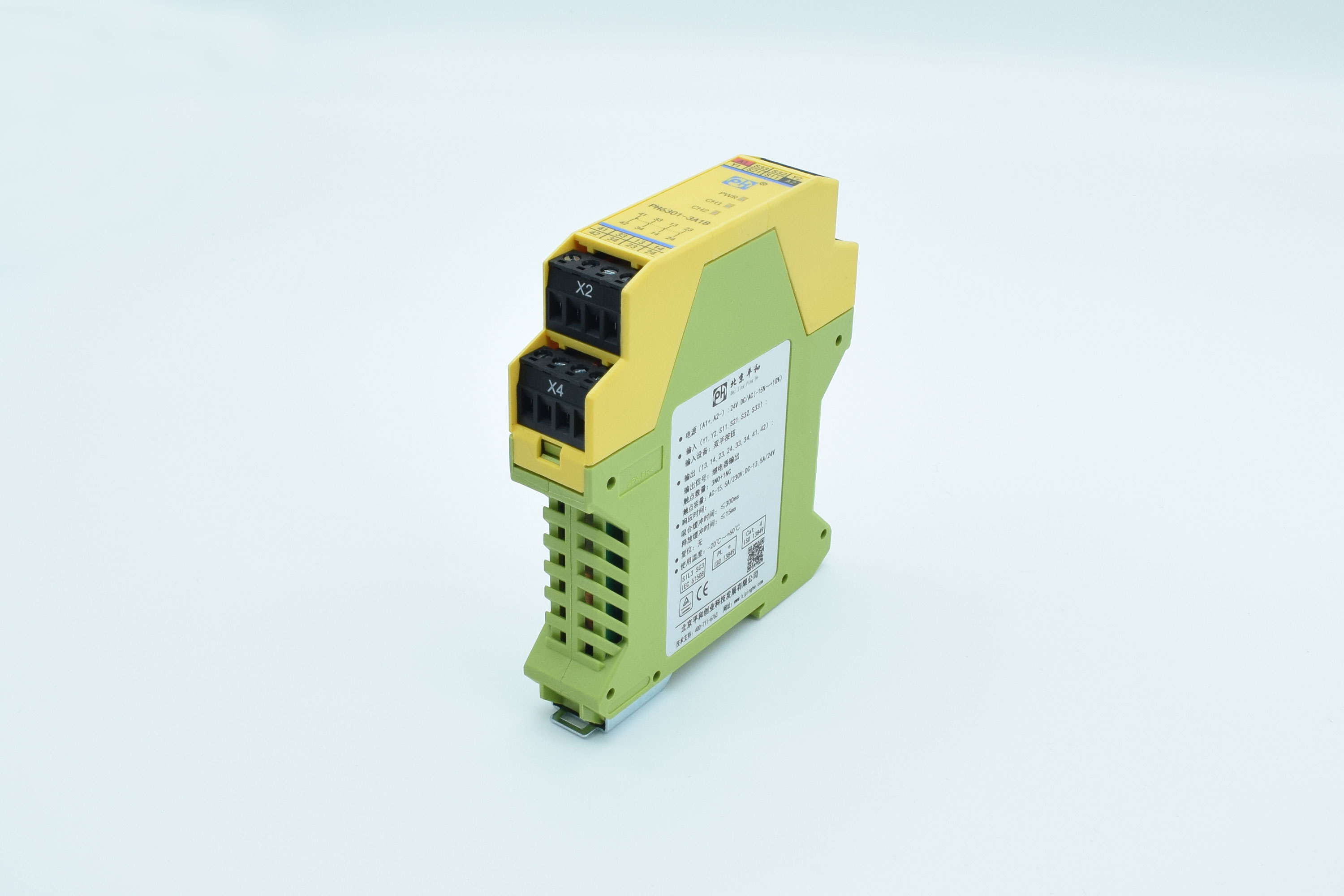 PH6103-2A2B是一款安全继电器控制模块,适用于急停按钮、安全门控制开关输入, 使用220V交流电源供电,具有2路常开(NO)安全输出触点和2路常闭(NC)辅助输出触 点的安全继电器。它支持单、双通道操作,手动或自动复位,并具有通道间短路监控功能。