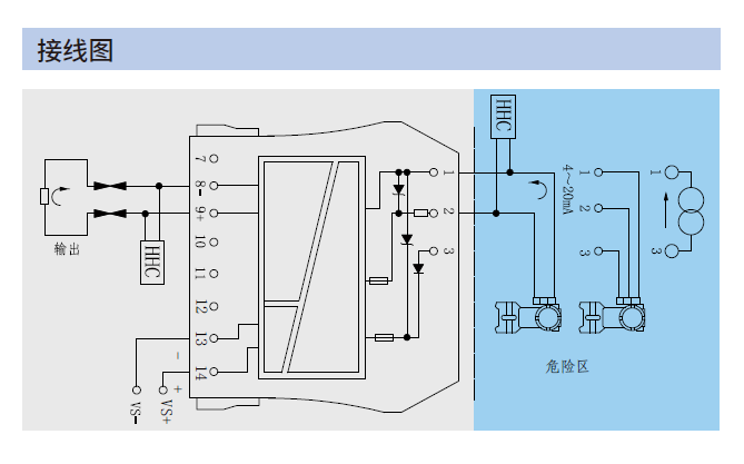 或电流源4~20mA信号,隔离传送到安全区输出,并支持HART信号双向通讯。变送器可