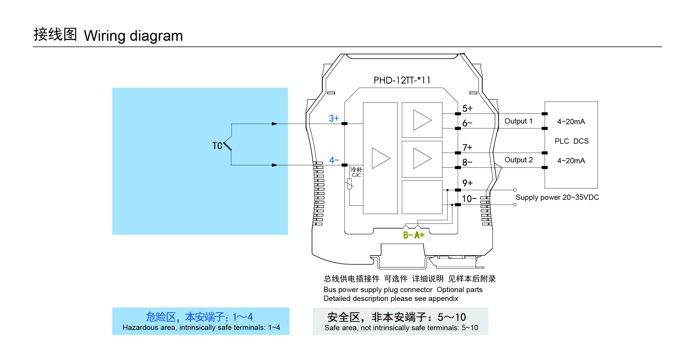 供电电压 | 20-35VDC,功耗<1.8W (24VDC供电,20mA输出时) |