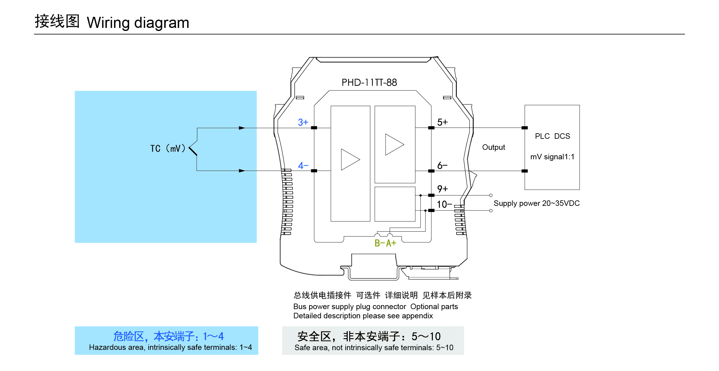 热电偶输入隔离式安全栅,可将危险区域内热电偶(TC)发出的毫伏信号1:1隔离传输到安全区。