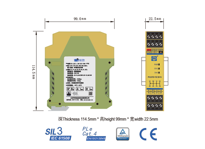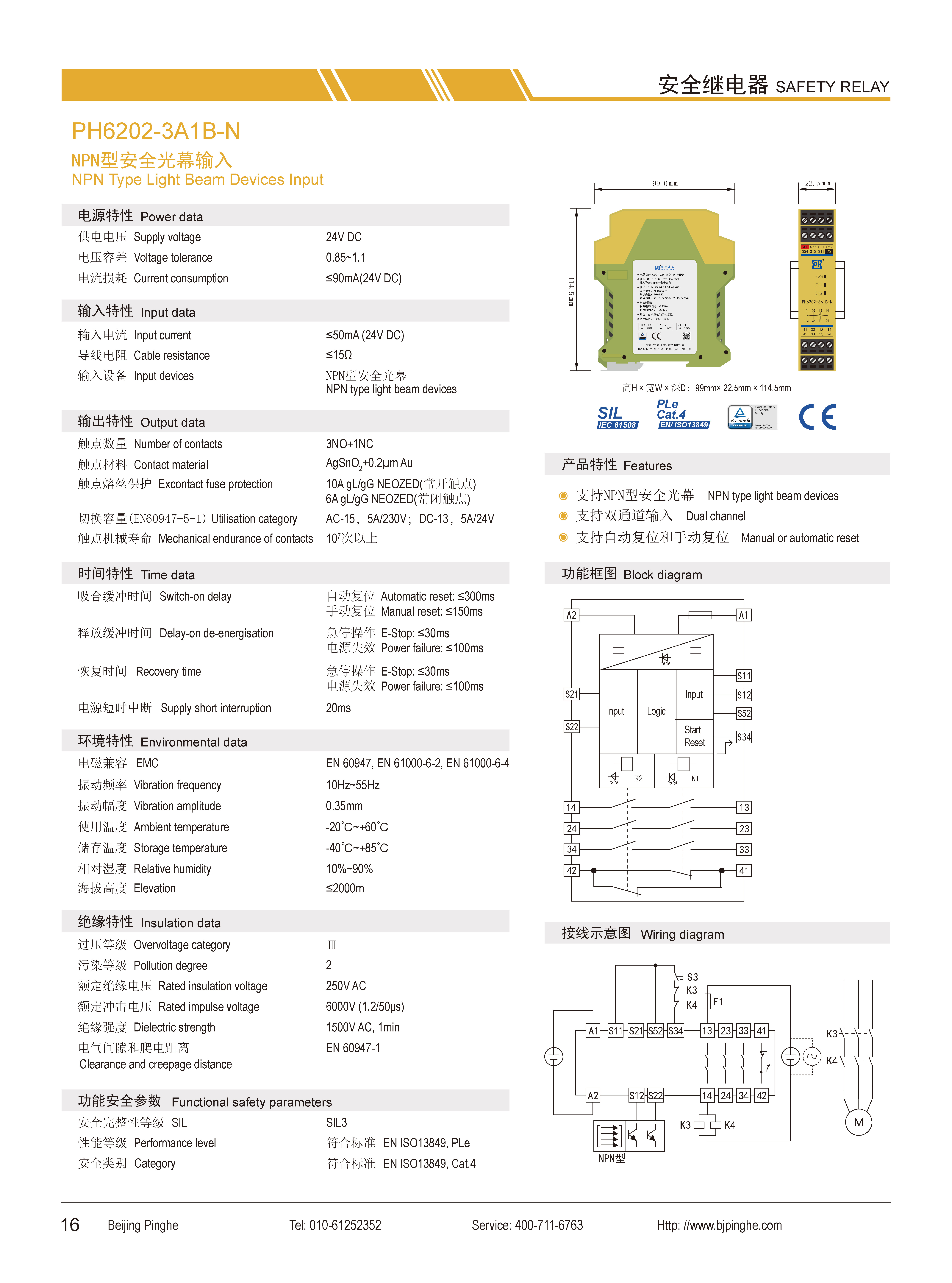 PH6202-3A1B-N是一款安全继电器控制模块,适用于NPN型安全光幕输入,具有3路常开(NO)安全输出触点和1路常闭(NC)辅助输出触点的安全继电器。它支持双通道操作,可选择手动或自动复位。