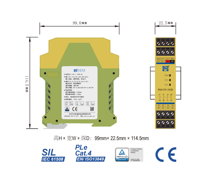 PH6103-2A2B是一款安全继电器控制模块,适用于急停按钮、安全门控制开关输入,