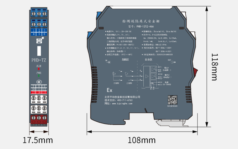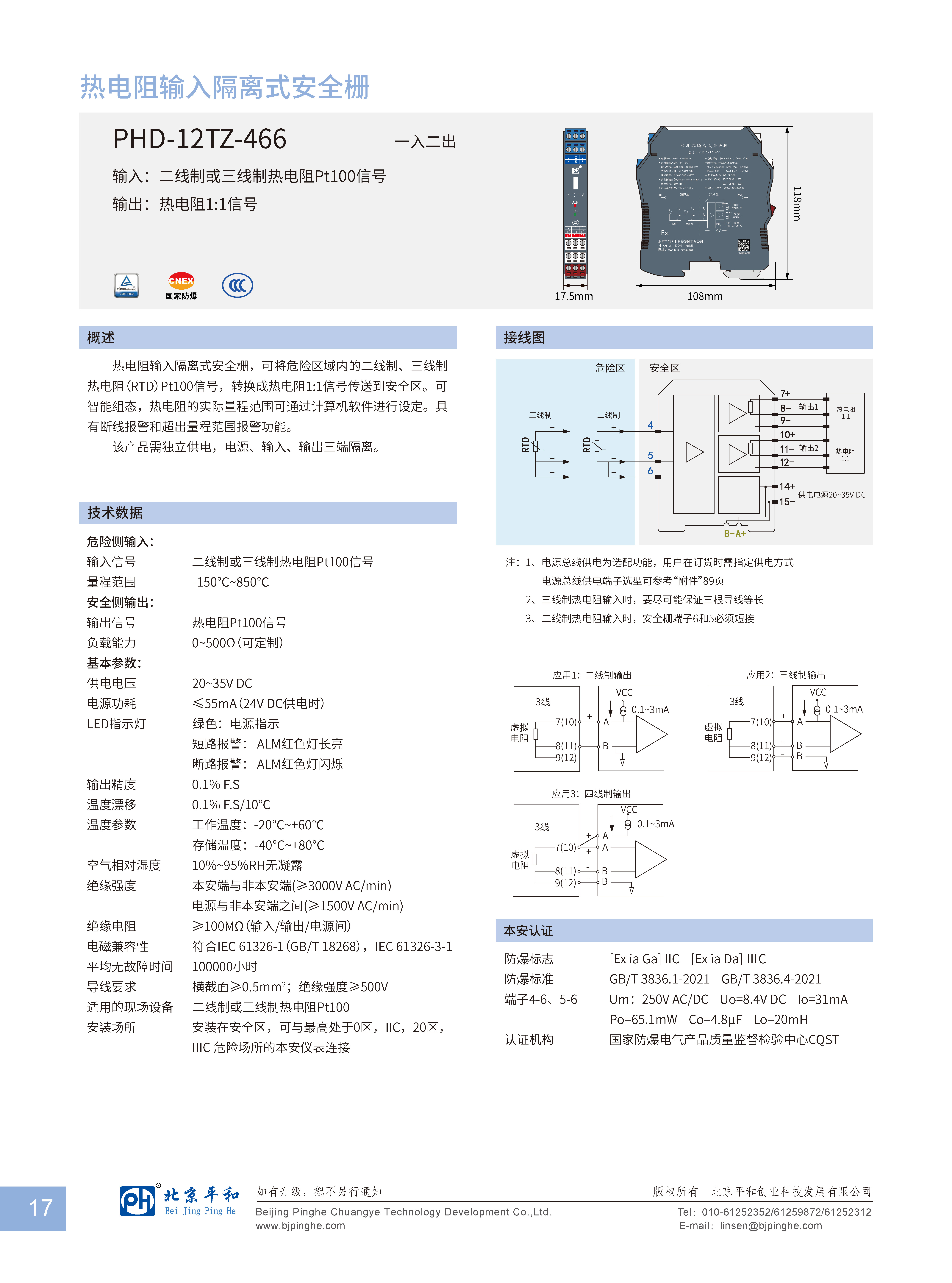 热电阻输入隔离式安全栅,可将危险区域内的二线制、三线制热电阻(RTD)Pt100信号,转换成热电阻1:1信号传送到安全区。可智能组态,热电阻的实际量程范围可通过计算机软件进行设定。具有断线报警和超出量程范围报警功能。