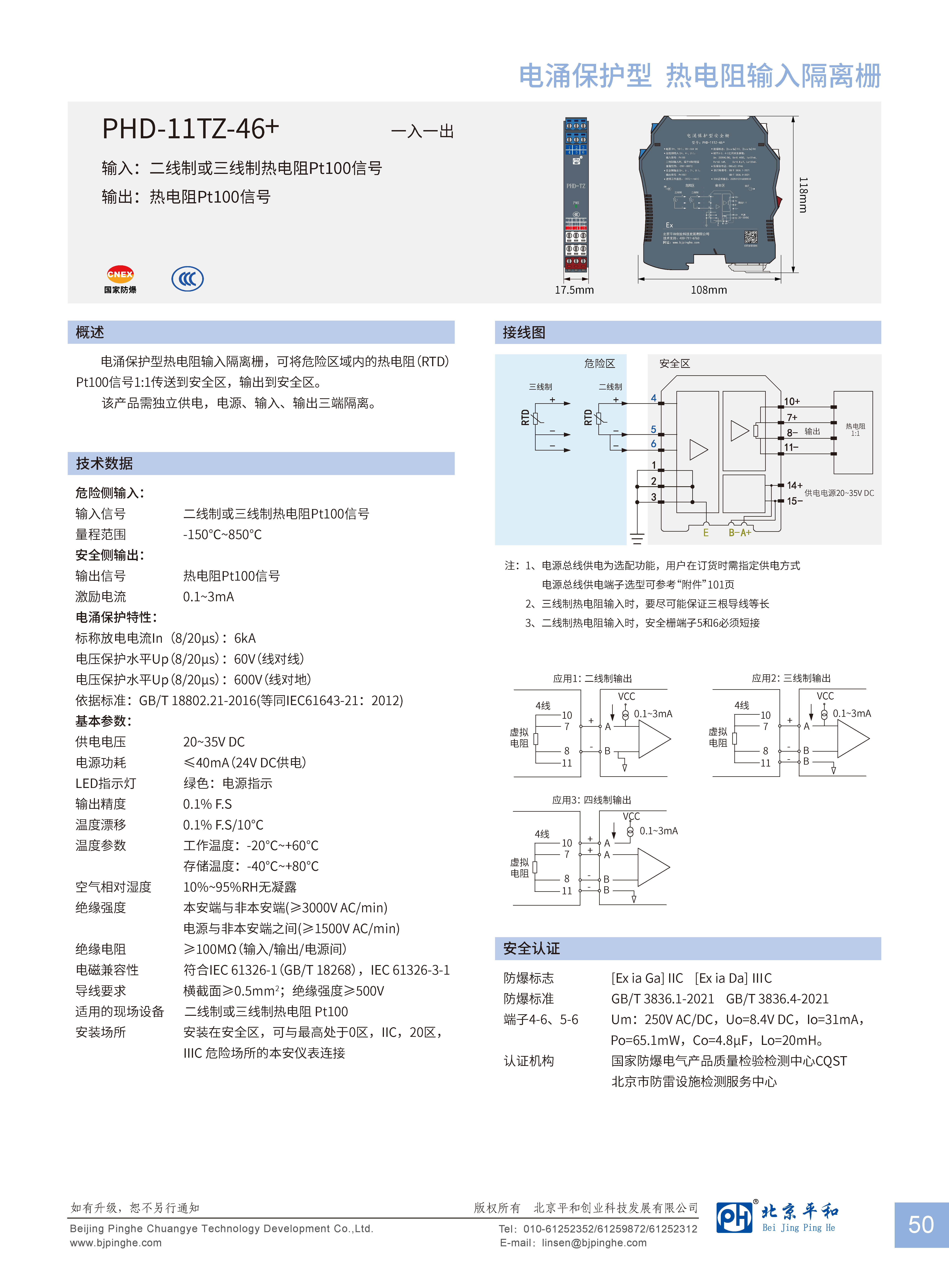 电涌保护型热电阻输入隔离栅,可将危险区域内的二线制或三线制热电阻(RTD)Pt100信号1:1传送到安全区。