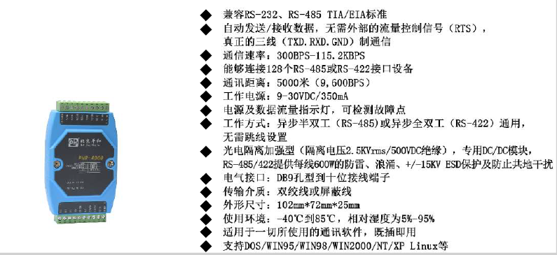 工作方式 | 异步半双工(RS-485)或异步全双工(RS-422)通用,无需跳线设置 |