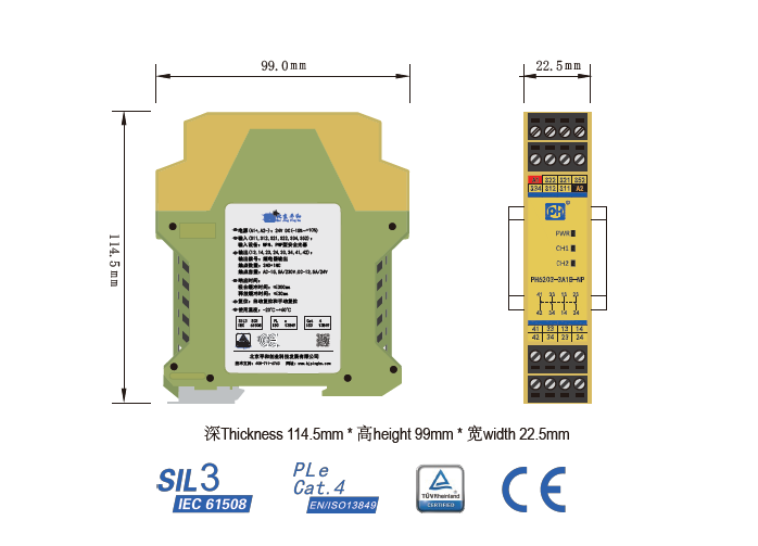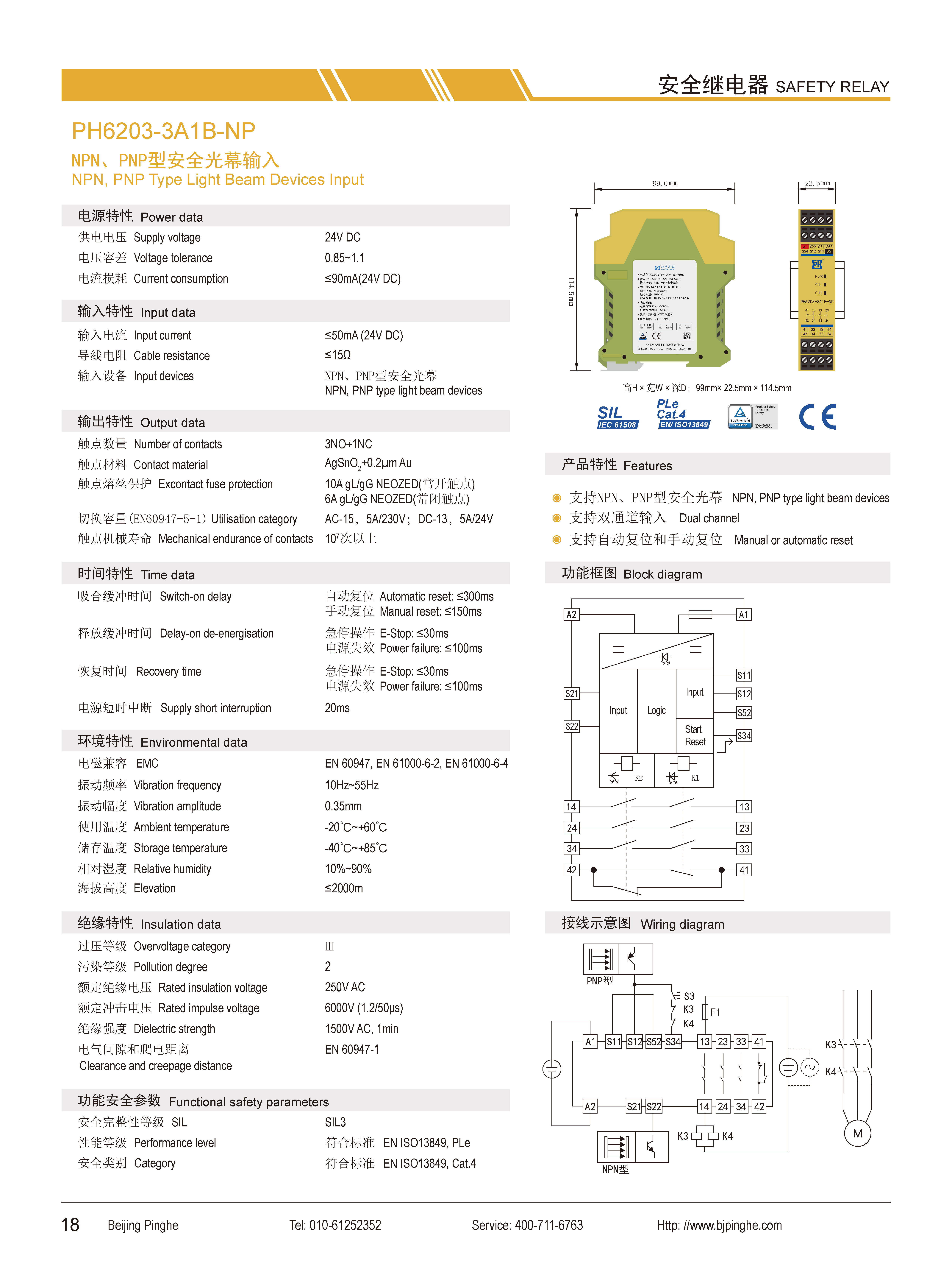 PH6203-3A1B-NP是一款安全继电器控制??椋视糜贜PN、PNP型安全光幕输入,具有3路???NO)安全输出触点和1路常闭(NC)辅助输出触点的安全继电器。它支持双通道操作,可选择手动或自动复位。