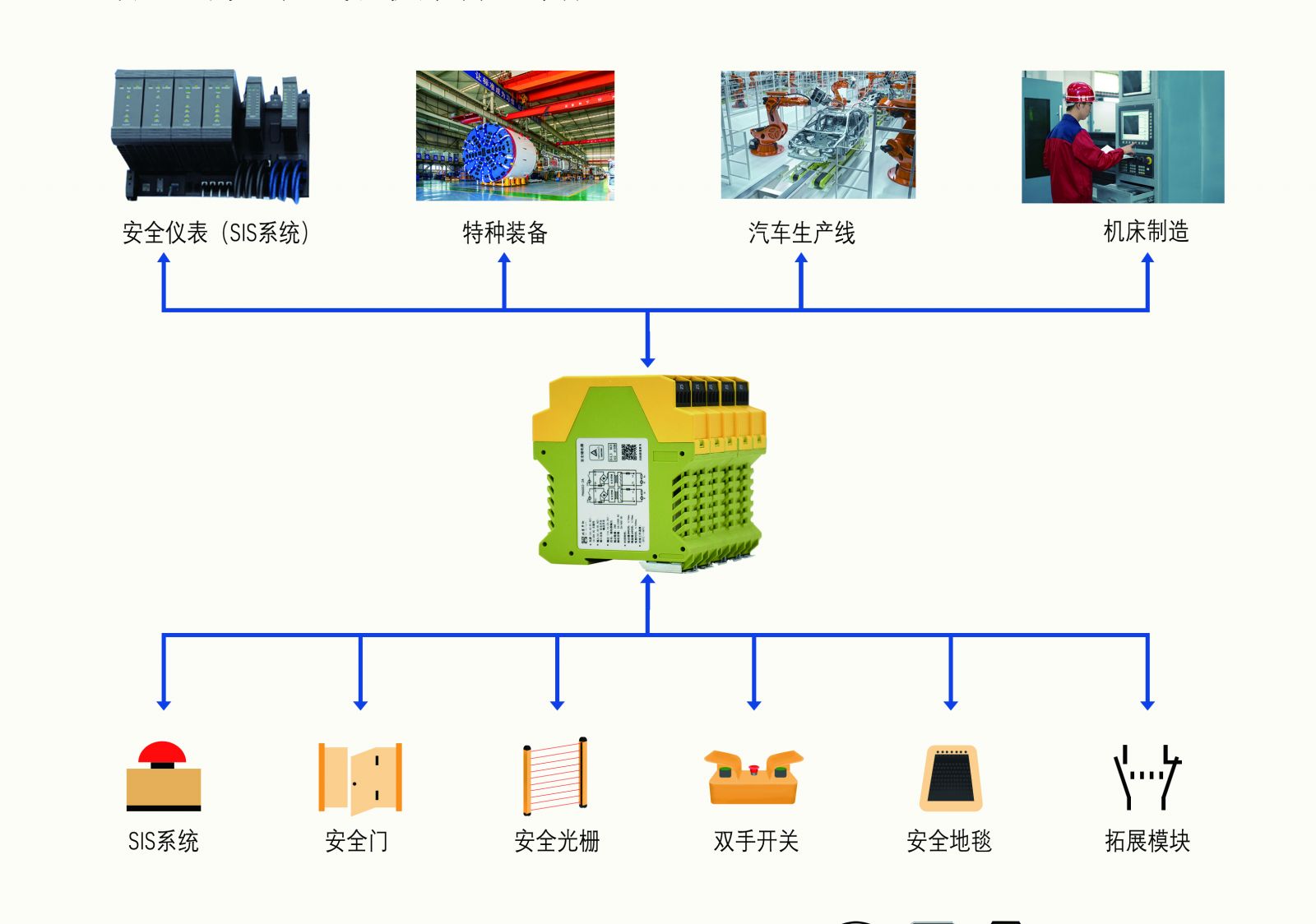 随着工厂自动化以及过程自动化对安全控制单元提出的更高要求, 电梯、机械工业及机器人和铁路等行业中的机械设备和工艺环节存在不同的安全风险和危险等级,安全继电器是为了保护不同等级机械设备和暴露在危险环境中的机械操作人员。广泛应用于安全仪表(SIS系统)、特种装备、汽车生产线和机床制造等行业。