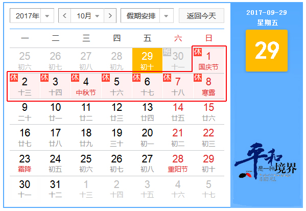 2017年10月1日至8日放假,共8天;9月30日(周六)上班;10月9日(周一)正常上班;