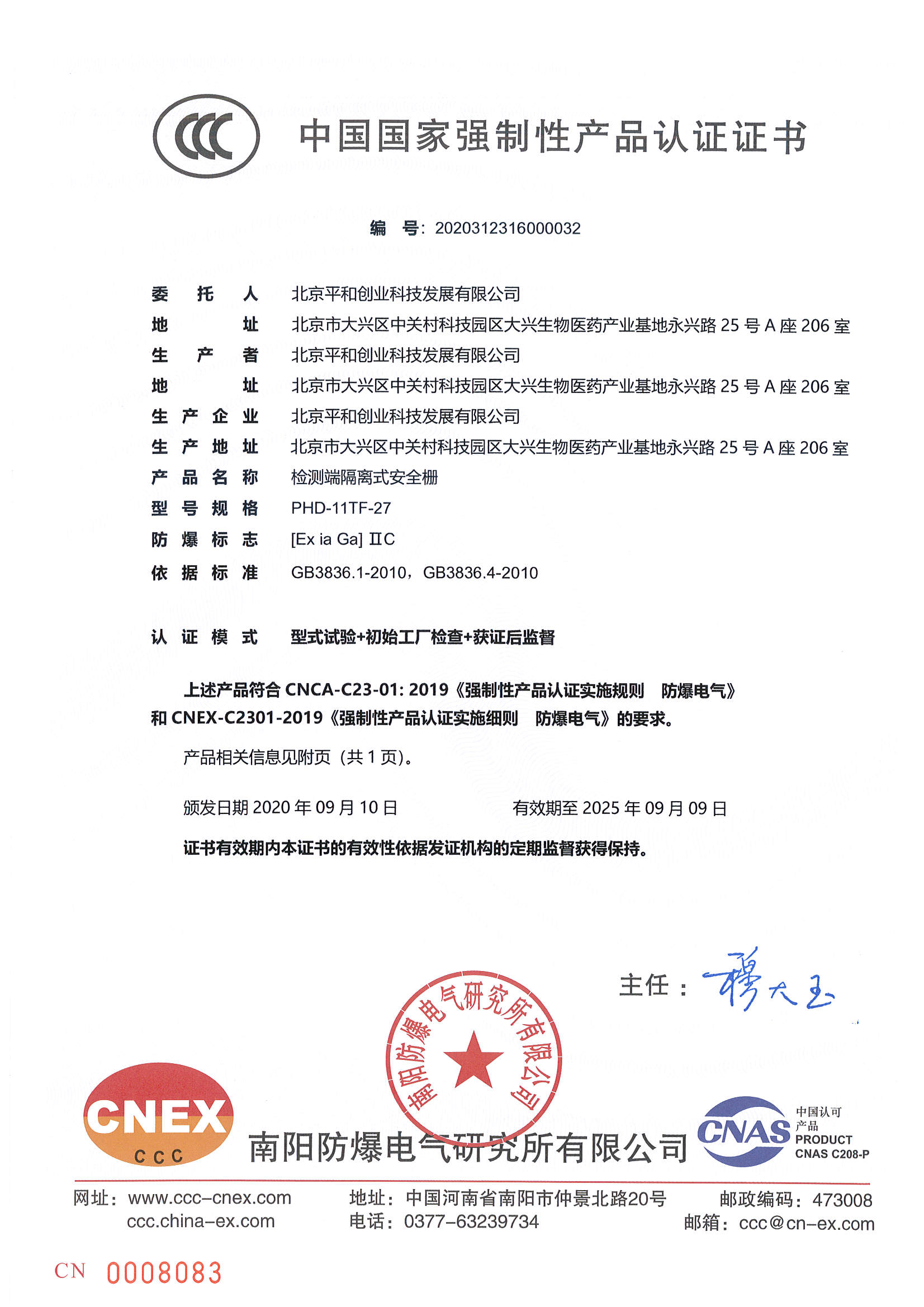 我公司本安产品于2020年9月10日全部获得了CCC证书。2021年6月,公司通过了南阳防爆电气研究所的工厂检查。