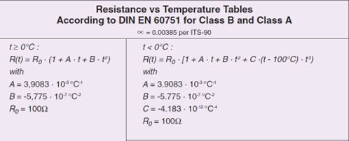 当测得热电阻阻值Rt后,对于铂热电阻Pt100,当R>=100欧姆时将电阻Rt代入以下一元二次方程,当R<100欧姆时将电阻Rt代入以下一元三次方程,利用一元二次方程求根公式或牛顿迭代法即可求得温度t。为了减小解方程计算量,也可以采用查表和线性插值法求得温度t。